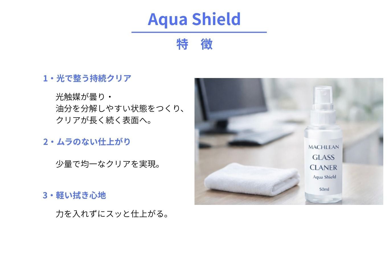 ガラス面をクリアに保つMachlean Glass Cleaner Aqua Shieldは、透明度を追求するあなたに最適なクリーナーです。この商品は、艶やかな仕上がりを実現します。光触媒効果によって、次回の掃除も簡単にしてくれるのが特長です。デザインはシンプルで扱いやすく、スプレーボトルの形状も手に馴染むため、どなたでも快適に使用できるよう配慮されています。