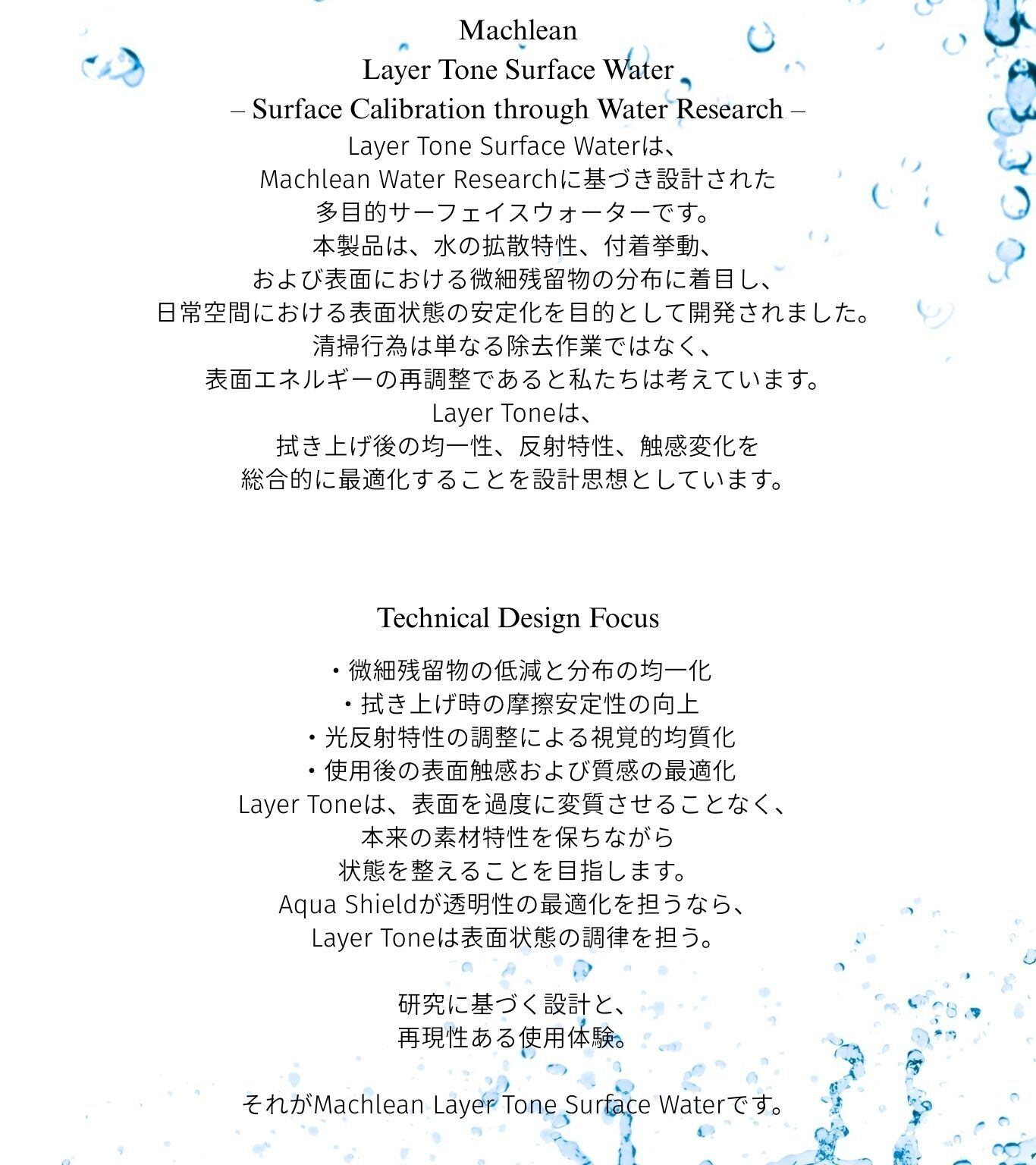 Machlean Layer Tone Surface Waterは、日常の掃除をラクにするために開発された仕上げ用拭き取りクリーナーです。ガラスやテーブル、鏡などあらゆる表面に使用でき、簡単にキレイに整えることができます。一度スプレーして軽く拭くだけで、輝きを取り戻します。使いやすさを追求した設計で、誰でも快適にお使いいただけます。